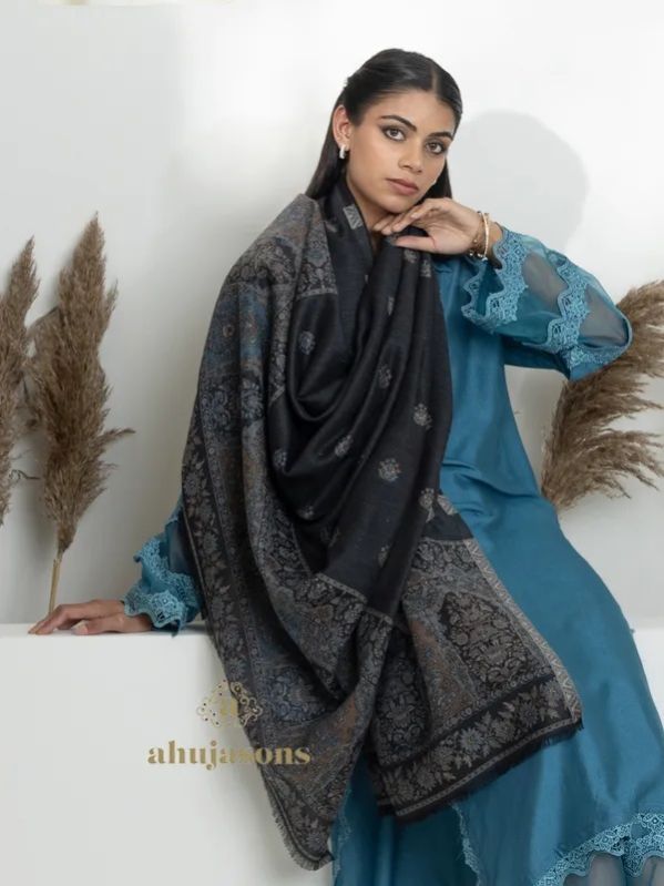 Elevate your winter wardrobe with this Black woollen Shawl. This masterpiece, featuring Kani Weave and adorned with a Kani Reversible design, is a staple for any sophisticated wardrobe. Ideal for both elegant gatherings and everyday warmth, this Shawl by Ahujasons embodies traditional artistry with a modern twist. Perfect as a thoughtful gift or a personal indulgence, the Black Shawl adds refined comfort and timeless charm to any ensemble. Embrace the season with this unique creation, blending heritage and style effortlessly.